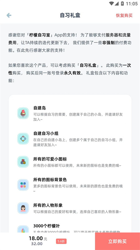 友情提示:自习礼盒提供的是非强制的付费功能,不影响应用的基本功能使用。购买为一次性购买,购买后同一账号永久有效。
