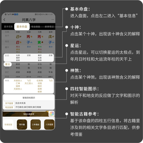 1、数据云存储 命盘数据云端存储,支持安卓、苹果、IPAD多个设备登录,更换设备数据不丢失。 2、排盘信息 支持公历、农历和甲子历排盘,支持真太阳时时间校对,支持年月日时四柱、胎元、命宫、身宫、大运、流年、流月、流日、流时排盘,附加十二长生、神煞、纳音、人元司令等运算。 3、智能古籍推荐 拆解《穷通宝鉴》、《滴天髓》、《三命通会》、《八字提要》、《神峰通考》等名著的经典论述,智能匹配每个八字,让您不用翻书也能读懂八字! 4、断事笔记 方便专业爱好者记录八字命主反馈信息,包括每个流年应事。不限存储容量,不怕丢失,随时随地翻看!问真八字排盘怎么看 问真八字排盘介绍