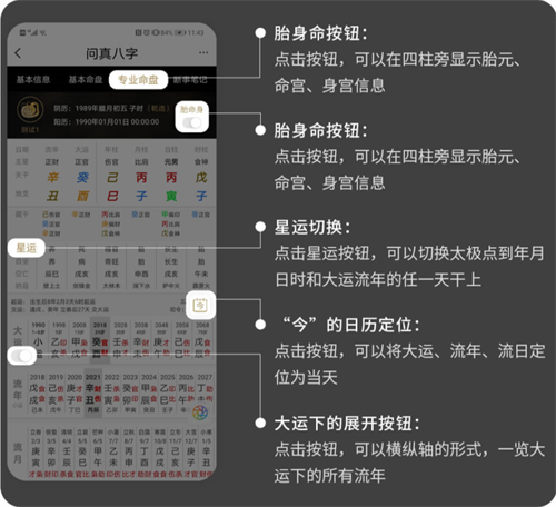 专业细盘在基本命盘的基础上,加上了大运与流年的罗列,便于大家进行命盘的时空研究。除此之外,还有几个细节功能需要留意: