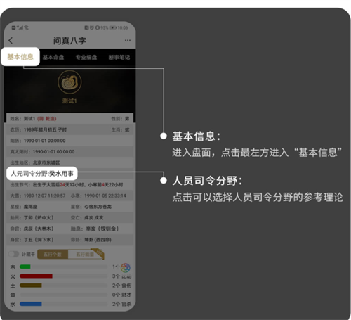 问真八字的盘面信息,共分为基本信息、基本命盘、专业细盘三个模块。