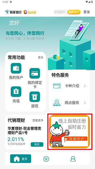 1、从本站下载韩亚银行app中文版手机客户端,安装后进入应用,在首先点击【线上自动注册省时省力】进入