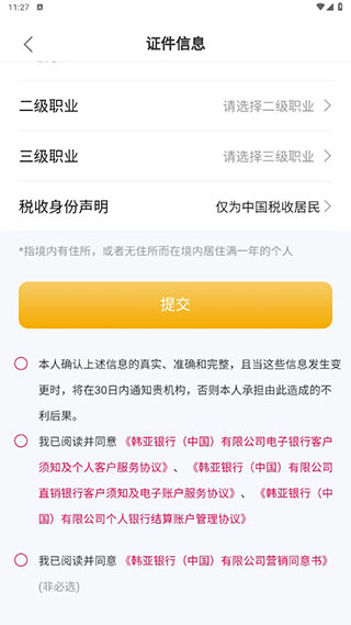 5、填写证件信息,并且同意软件所有协议,点击【提交】即可,稍后会有韩亚银行客户经理与您联系,请耐心等待