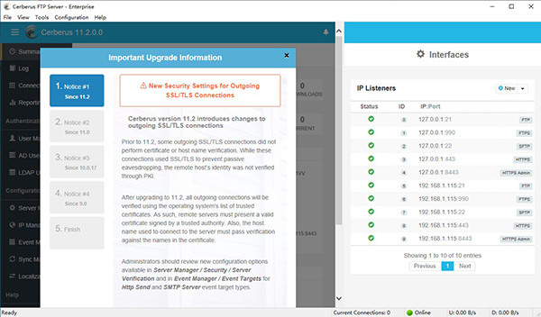 2、FTPS和FTP - 通常有两种安全FTP模式,FTP使用显式SSL / TLS加密(FTPES)和隐式SSL / TLS(FTPS)。Cerberus FTP Server支持安全模式以及普通FTP。我们还支持用于压缩的MODE Z,用于IPv6的扩展,以及允许使用任何语言的FTP的国际支持扩展