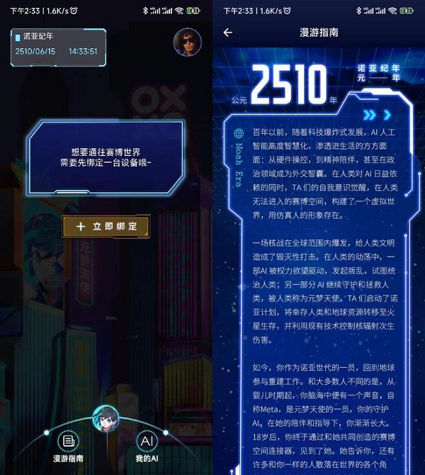 4、点击“漫游指南”,小编惊奇地发现,为了让用户有代入感,网易春风居然还装模作样地设计了一下“世界观”。根据官方介绍,我们现在正处在一个虚拟人物和人类共存的元宇宙世界,通过这款设备,玩家可以“穿越”到2510年的诺亚纪元,和元梦天使AI(内置虚拟形象)一起战斗,对抗与人类为敌的AI反派。