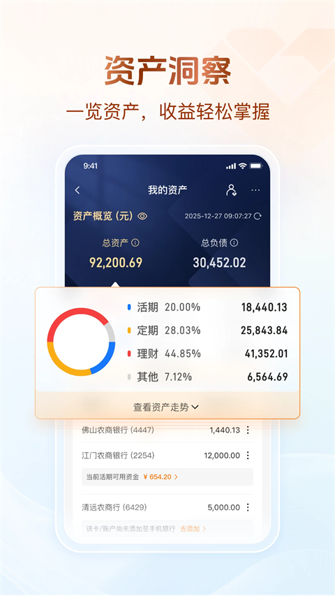1、随时随处,方便快捷您可通过手机注册、网银注册、柜台注册等多种方式注册使用我社(行)手机银行。开通方式不同,业务权限也不同。使用我社(行)手机银行,您可在任何时间、任何地点轻松管理账户、转账汇款、缴纳费用,突破时间、空间的限制,将银行“搬”到您身边。“指尖上的生活,一触而就”。 2、功能齐全,应有尽有提供账户查询、资金管理、转账汇款、充值缴费、理财服务、积分管理、个人贷款等多项金融服务。 3、安全可靠,用得放心我社(行)手机银行客户端采取信息加密、账号与手机号绑定、动态验证码、个性化预留信息、静态密码、短信口令、交易限额控制等多重安全措施,确保您的账户资金安全。 4、金融助手,贴心服务推出“金融助手”栏目,无需登录即可轻松查询最新、最实用的金融行情资讯、网点地图、特惠商户、银行公告等信息,为您提供贴心服务。 5、多种主题,彰显个性提供了春、夏、秋、冬等多个主题,您可根据自己爱好选择,彰显个性。广东农信手机银行APP业务介绍