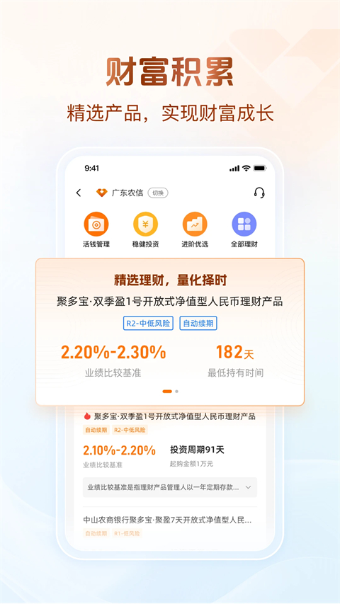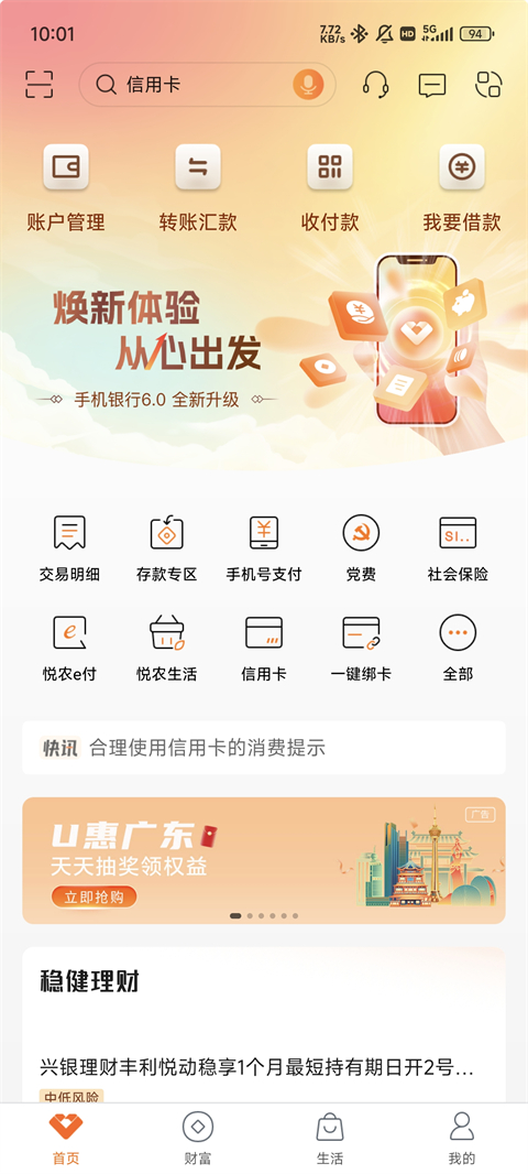 1、智能推荐,千人千面 根据您的日常使用习惯,为您推荐最适合的理财服务和自定义金融服务功能 ,打造专属于您的财富人生。 2、消息提醒,更贴心 智能提醒服务,通过APP推送的形式,为您推送理财到期、贷款还款、动账提醒、生日祝福等服务,服务更加贴心。 3、功能齐全、应有尽有 为您提供金融、生活、政务综合一体化服务,给您带来最极致的体验。 金融功能:账户查询、资金管理、转账汇款、理财服务、积分管理、贷款服务。 生活功能:悦农生活、生活缴费。 政务服务:电子社保卡、公安网证、粤省事、etc。广东农信手机银行APP特色