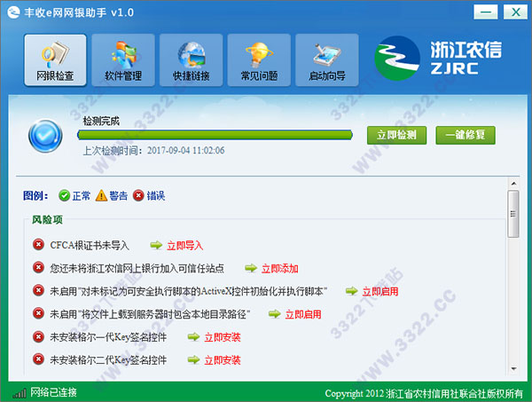 2.进入软件后网银助手将自动进行网银检查,或您可点击“立即检测”按钮再次检测您的计算机设置。检测完成后,请点击“一键修复”,或根据风险项的提示逐项修复,使您的电脑达到使用丰收e网的最优环境。您还可以在网银助手“软件管理”菜单内,分别安装控件、驱动程序,调整您的计算机设置。