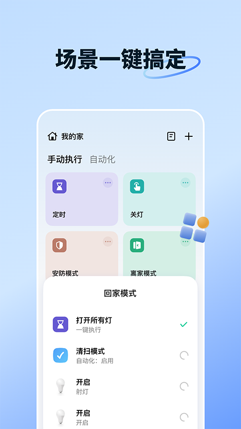 1、远程控制家用电器,省心,省电,随时随地想开就开。 2、可以同时添加多种家电,一个APP控制所有智能设备。 3、灵活设置定时任务,按时准确执行。 4、一键共享设备给家人朋友,全家轻松享受智能生活。 5、快速连网,无需等待,享受极速体验。 6、页面简洁,操作简单易懂 7、相应迅速,连接稳定智能生活使用指南