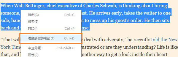 5、先选取,后右键,也能一键收藏到傲游笔记。