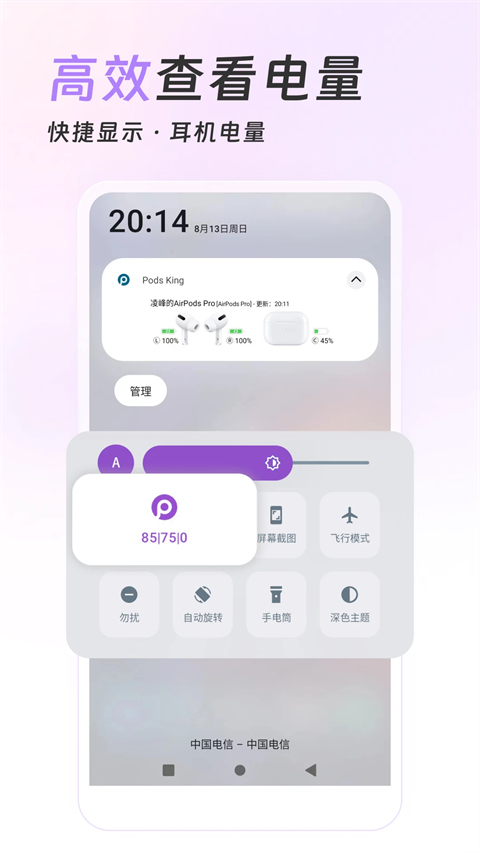 1、无需担心自己的耳机电量会在自己不知道的情况下全部用完,airpods king能帮助到你; 2、这个工具能让大家更轻松自由的去使用,所以还是特别方便简单的; 3、设计的样式也是更为不错的,喜欢的用户都是可以下载到手机中去用的; 4、在Android端电量弹窗查看工具,支持AirPods1、AirPods2、AirPodsPro,Beats耳机等; 5、为了解决Android用户使用AirPods蓝牙耳机无法查看电量等信息和自定义触控指令而开发的; 6、目前功能包含卡片弹窗、通知栏显示电量,双触摸四触摸控制等,免费、无广告; 7、电量即时显示,触控指令编辑,设计简洁优美,通知栏快捷控件。更新日志