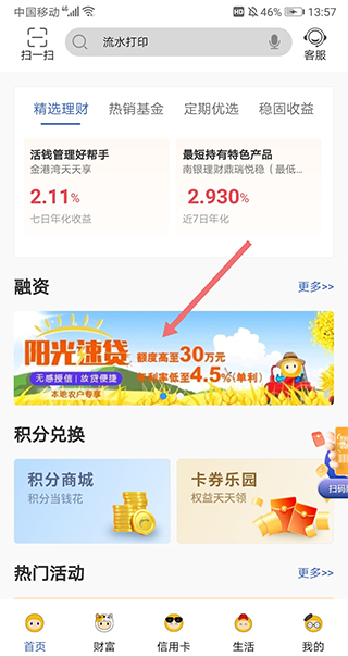 1、张家港农商银行APP想要办理贷款的话可以直接点击阳光速贷广告页。