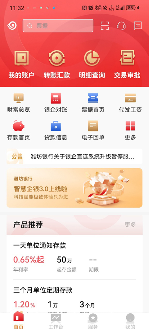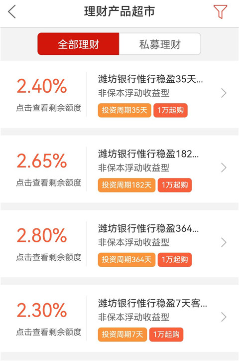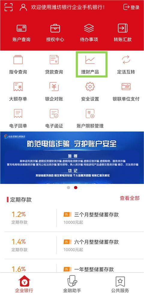 1、方便快捷 您只要注册成为潍坊手机银行客户,从此便不用跑网点排长队,不再发愁错过营业时间,足不出户即可享受7×24小时全天候金融服务。 2、服务贴心 专业团队为您提供7×24小时的技术支持,让您放心畅享我行的网络金融服务。 3、安全可靠 给您提供先进的U盾安全产品,并提供身份认证、限额控制、多重密码验证、银行后台实时交易监控,预留防伪信息验证、私密问题设置,以及国际最先进的软、硬件网络技术保障信息传输的安全性,重重保护您的资金安全。 4、费用低廉 优惠幅度大,免去众多费用,转账汇款享受超低优惠。 5、功能丰富 提供多项金融服务,包括账户查询、转账汇款、缴费支付、公务卡还款、投资理财等各类金融服务。潍坊企业银行App如何查看理财产品