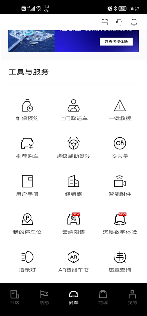 3、点击进入爱车,这里为用户提供了很多的工具和服务,用户可以进行维保预约、一键救援、上门取送车等操作。