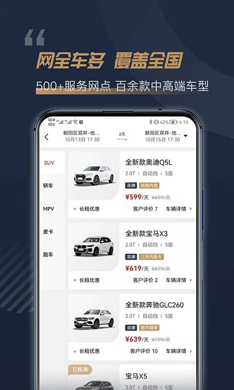 1、安全出行,优质体验 为您提供7x24小时管家式服务,保障隐私安全,放心出行; 2、新人红包,价格优惠 注册可获得新人尊享礼包。首日0租金;芝麻信用押金减免,消除您的出行租车压力; 3、产品功能,租车更优 专注于为用户提供中高端车型租赁的手机服务软件,提供查询所在城市现有车型及概况、租金和服务费用、当前优惠信息、以及注册、下单支付、呼叫客服等功能; 4、租车网点,全国覆盖 租车业务覆盖全国,现已入驻20多个城市设有600余个服务网点;百余款中高端车型,在全国范围内提供24小时的自驾和预约租车个性化用车服务; 5、车型丰富,随心选择 主要品牌:奔驰、宝马、奥迪、沃尔沃、路虎、特斯拉;主要车型:轿车、SUV、商务MPV、跑车、皮卡;经济型车、舒适型车、商务型车、豪车、新能源车等。功能介绍