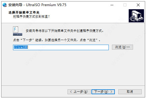 3、选择开始菜单文件夹,点击浏览可以自由选择文件夹:默认文件夹【UltraISO】。