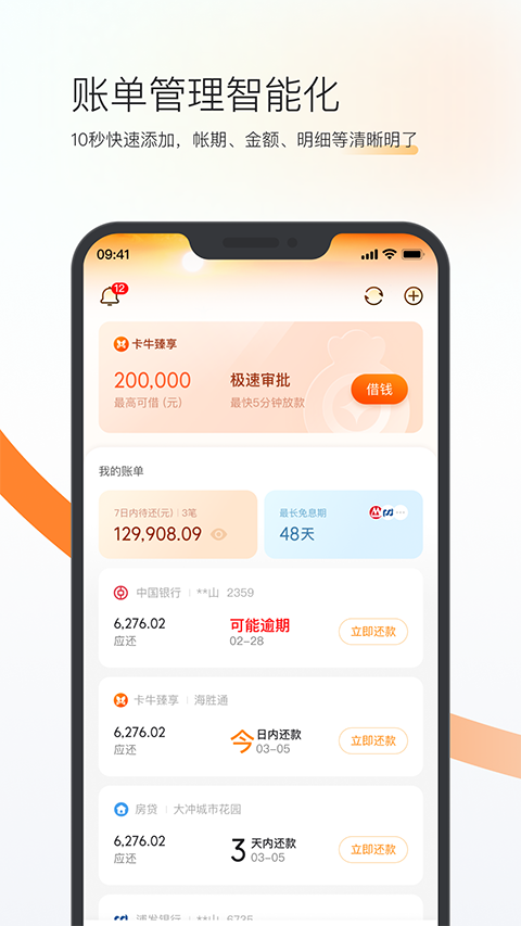 1、贴心的账单日历功能 账单日、还款日、还款金额、免息期等账单信息的日程管理,智能提醒避免逾期; 2、多种类账单管理 信用卡,网贷,房贷,车贷,水电费,燃气费,物业费,房租等各种账单一网打尽; 3、多机构账单管理 支持招商银行、工商银行、中国银行等127家银行账单的一键导入,支持100+贷款机构账单添加,轻松管理多张卡片;软件特点