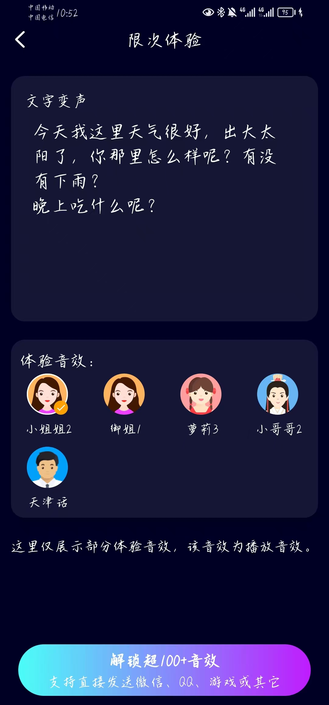 在文字变声页面输入一段想要“变声”的文字,试听音效效果,满意后可直接保存分享。