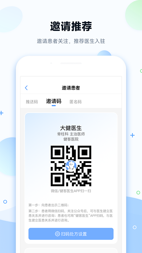 1、学术交流 提供领域专家专题线上讲座、学术会议交流及疾病专栏文章,实时跟进最新诊疗指南。 1、药品齐全 自营药房经营20万+药品,种类齐全,满足日常开方需求。 3、高效管理患者 在线管理患者健康档案和电子病历,线上轻松触达患者,可定向发送患教内容、量表评估。 4、阳光收入 医事服务费透明可查。 5、合规互联网执业 资质齐全,互联网医院护航,监管平台监控诊疗行为,执业安全有保障。更新日志