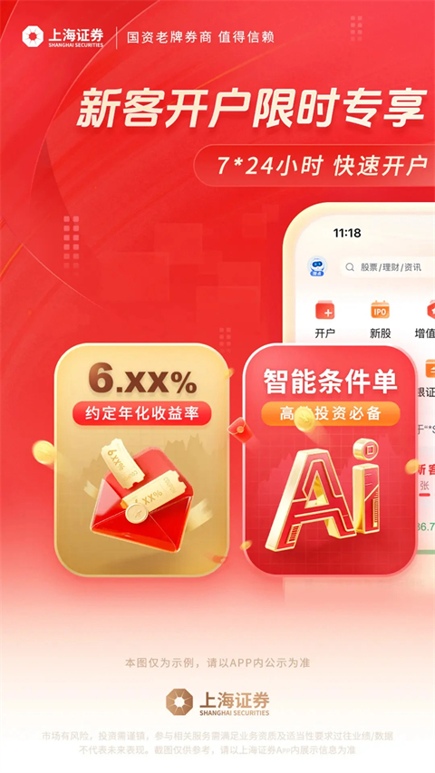 【开户专享】 1.新客理财:开户尊享约定年化收益率6.XX%的新客理财券。 2.嗨币积分:开户即送6666嗨币商城积分,海量活动畅兑好礼。 3.专属服务:智能小海、常伴式理财、在线投顾等个性化投资理财服务等您来。 【特色服务】 1.智能化交易体验:AI智能盯盘整合了定价买入/卖出提醒、日涨跌幅买入/卖出提醒、反弹买入提醒、回落卖出提醒、开板买入/卖出提醒、止盈止损提醒等12大策略进行场景式盯盘,不仅适用于个股,更涵盖了国债逆回购、理财产品提醒等服务。毫秒级信息响应速度,让投资者不再错失交易机会。 2.陪伴式投资理财服务:通过构建千人千面的理财服务,为投资者营造集大数据分析、持仓基金陪伴、产品定制化服务、投资组合配置于一体的智能陪伴体验,为资产保值增值保驾护航。 3.沉浸式小海直播间:通过直播间、小海沙龙、@我等栏目实现精选盘面资讯、线上投顾互动解答、市场热门话题讨论等功能,打破时空限制,为您提供沉浸式的1V1个性化互动体验;更有VIP“组合赢”投资咨询服务产品,精选组合等您Pick! 4.全方位决策辅助内容:依托算法模型及海量数据分析,集4大类20+项数据工具、全市场&上证独家近20种财经信息流,7*24小时滚动展示,使AI赋能决策,帮助投资者洞察市场全貌,作出更优决策。投资市场,先机在握! 5.极简式全业务办理:集8大板块40多项业务、智能预判、贴心陪伴、自助查询,深度覆盖业务需求,精简办理流程,帮助投资者更充分地认识自己,从“知资产”、“知盈亏”提升到“知能力”、“知风险”,紧跟热点,从容应对,随时随地办业务。上海证券开户的流程介绍