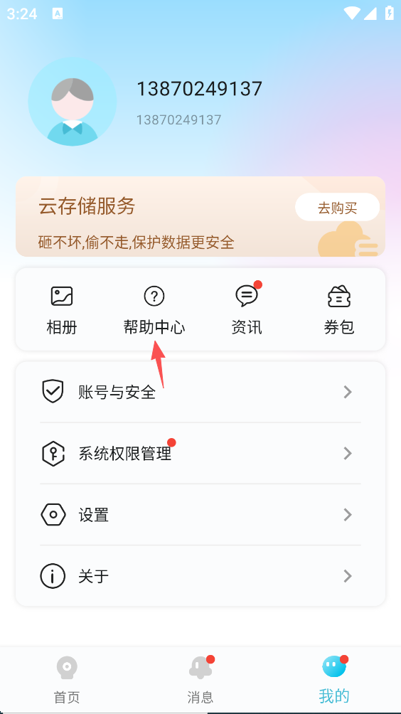 2、点击“帮助中心”。