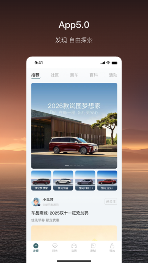 1、发现:了解官方资讯、与伙伴分享快乐,关注更多感兴趣的伙伴。 2、活动:岚图官方线上线下活动的聚合板块,可轻松报名参与活动。 3、岚图:了解岚图FREE,预约岚图FREE。 4、礼遇:赚取岚图积分,岚图生活礼遇。 5、我的:与岚图共同成长,查询订单,邀请好友一起分享惊喜。岚图汽车app使用方法