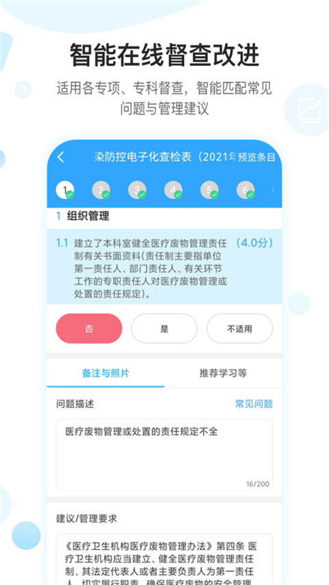 1、轻松解决医疗机构督导问题,让督导人员的工作压力降低。 2、全面督导重点患者,严格把关避免出现任何不良情况。 3、学习手册汇聚大量知识,轻松学习机构制度知识,参与培训。 4、智能系统保存全部历史督导记录,不会出现任何误差。 5、职业级防护标准,严格检查环境保护不会存在隐患。软件亮点