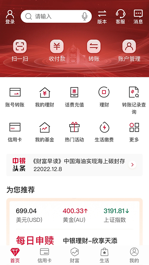1、【一键开启,便捷为您】 中国银行App官方版面向新市民、县域、养老、代发薪、少数民族、交通出行六大客群,打造专属服务体验。 2、【一键解锁,智富为您】 创新推出财富管理开放平台,财富购物车、家庭财富全景视图、资产报告和资产诊断、甄选产品池、陪伴式服务、全方位安全保障六大王牌财富服务,通过专业、智能的财富管理能力,帮您管好“钱袋子”。 3、【一键触达,惠泽为您】 全新上线重点帮扶公益版块,引入中行精准帮扶平台“公益中国”,助力乡村振兴,搭建“爱心捐款”公益版块,提供扶贫救灾、教育助学、扶老助残三类捐款通道;生活频道合作商户拓展至16大类400余;全新升级权益中心,积分兑换权益更丰富。 4、【一键乐享,快乐为您】 中国银行App官方版还聚合四大特色场景,推出“福仔云游记”养成类游戏,升级趣味玩法,让金融也可以很快乐!中国银行app能查个人征信吗