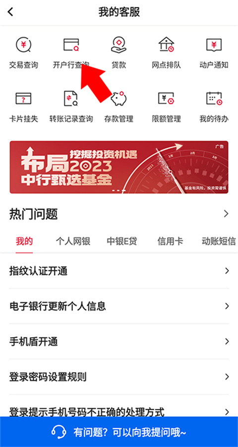 3、进入客服界面后,点击开户行查询并输入对应的卡号即可