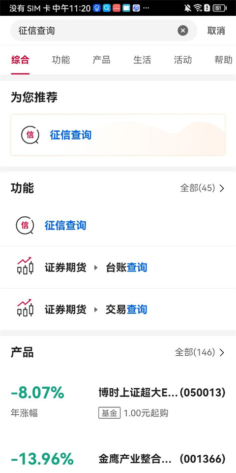 1、打开软件,在首页上方搜索框内输入征信字样, 然后点击“征信查询”