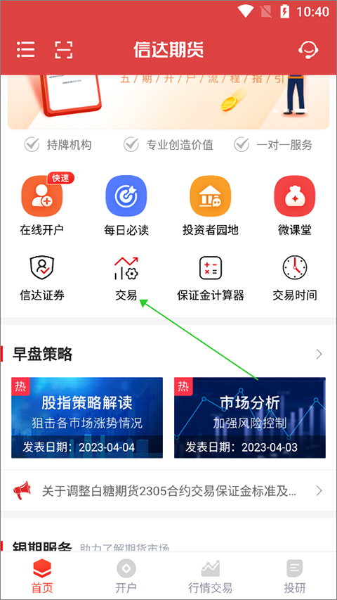 1、首先打开并登录信达期货app进入首页中点击【交易】;