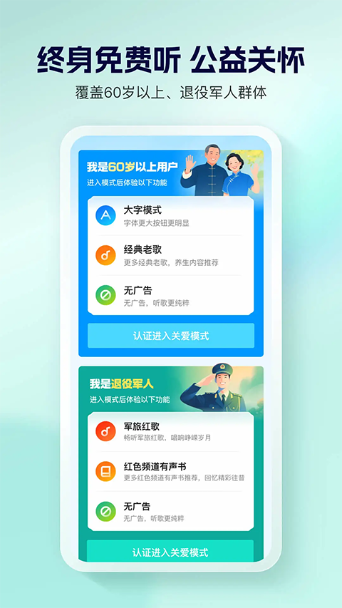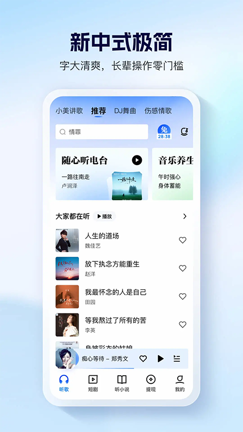 1、千万歌曲随便听 经典老歌、广场舞、红歌、民歌、戏曲、轻 音乐……为你定制,还能听歌识曲 2、打开一看就会用 字大、简单、实用的音乐播放器,再也不用等儿女教 3、音乐陪你一整天 跳广场舞、做家务、带小孩、睡不着,都能找到适合你的歌!下载听更省流量 4、随时随地唱好歌 一起K歌吧?喜欢就要唱出来!百万歌曲等你一展歌喉 5、精彩视频看不停 经典影视、广场舞、搞笑、健康等视频,让你慢慢享受休闲时光更新日志