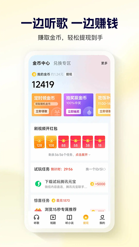 1、【酷狗旗下】 全新版本!海量正版音乐、经典歌曲免费畅听 2、【APP更轻】 性能极致优化,用起来不卡,旧手机也能流畅用 3、【热门好书】 穿越、悬疑、复仇、霸总、虐恋文,应有尽有 4、【热门短剧】 限时体验多种人生,随时刷剧,放松自我功能介绍