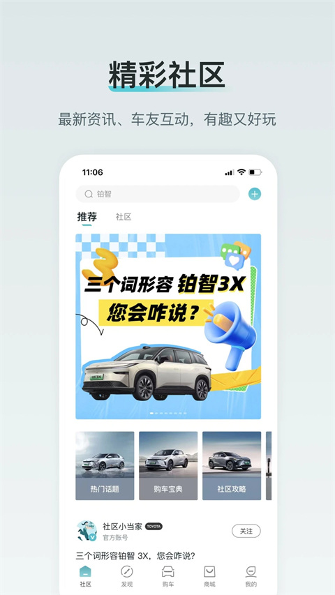 1、发现 用户进入软件内会看到发现页,在这个页面用户可以查看推荐内容,也可以到社区去进行话题探讨评论,还可以查看汽车资讯。