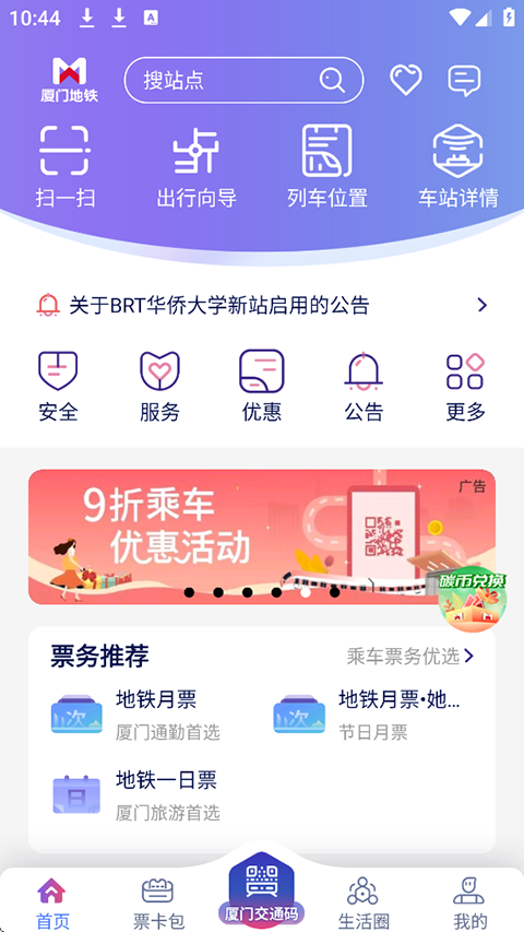 1、在线购票:打开厦门地铁APP,进入首页“电子票区”入口进入“购票”页面,线路图上选择或搜索站点名称确定好起始点和购票数量,即可在线使用支付宝或微信直接购买电子票。 2、出闸方便:进出站时,只需在首页的“行程”选项中点击“进站”或“出站”,即可分别获得“进站二维码”和“出站二维码”,并贴近闸机前端的扫描区进行检票,听到“嘀”声和提示灯亮起,即可顺利开启闸道进出站。 3、地图导航:点开立体图,就能让你对站内设施一目了然;需要换乘其他交通工具,点开“站点”选项,你就可准确掌握附近公交车、BRT、共享单车停放点等信息,一键导航功能更是“路痴”的福利;出站后,点开街区导向图,搜索智能周边推荐,你就能及时了解到吃喝玩乐购等公共服务资讯,特别适合到厦门旅游的游客们。 4、官方免费wifi:一键上网,让你在飞驰的地铁上享受飞速的无线网络。更新日志