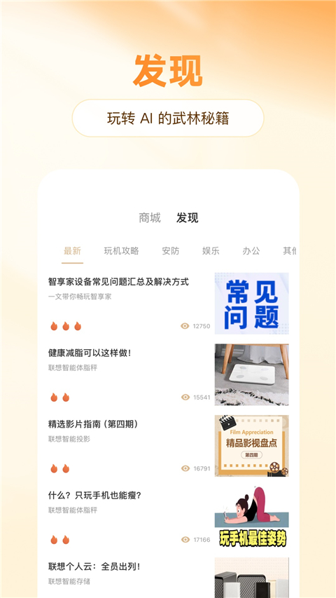在主菜单点击 I-app_community(发现),您可以查看联想音箱MINI和联想电子产品、社区活动以及产品评价等信息。