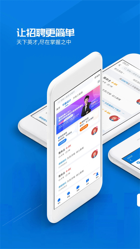 1、附近人才:好人才其实就在你身边; 2、招聘海报:一键分享微信,轻松招聘; 3、职聊:和未来员工在线聊,合适就入职。特色功能