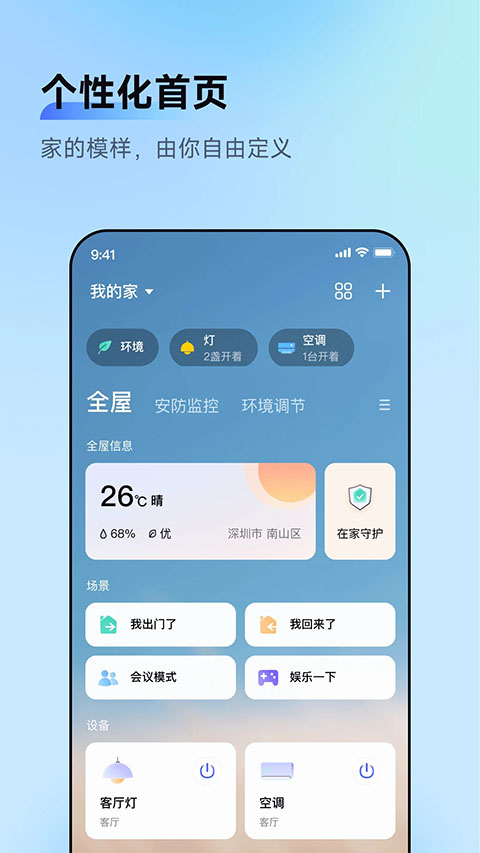 1、随时随地控制您的Aqara设备; 2、创建家庭和房间,并将设备分配到您的房间; 3、控制设备和查询设备状态,例如:调整灯光亮度,查询耗电量;监测温度,湿度和大气压;检测漏水,检测人体移动等; 4、新建一个场景,实现批量控制多个设备。例如,关闭所有灯光,风扇等; 5、新建一个自动化,实现自动控制设备。例如:添加定时来自动开关插座;设置门窗打开时自动开灯。软件功能