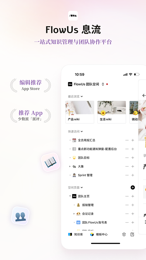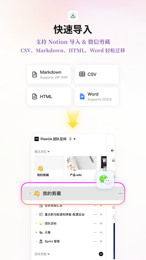 【文档笔记】 一键插入文字、表格、代码、音视频、网页内容,并支持嵌入第三方服务,满足多场景创作需求。 【多维表】 在传统数据管理表格内融合了在线协作、信息管理和可视化视图能力,一键切换多种视图,自由搭建个性化、轻量级的业务管理系统。 【文件夹】 支持多格式文件的高速上传、下载及预览,并通过电脑、手机随时随地查看、编辑、共享和协作。 【团队协作】 通过搭建团队空间,结构化沉淀和管理工作流程,多人多端实时协同互动,构建企业自己的一站式工作中心。 【轻松上手】 支持快速迁移、导入CSV、Markdown等多种格式的本地文件。强大的数据迁移能力,零成本开启知识管理新体验 【大量模版】 多种场景,轻松开箱应用,提供100+解决方案模版,一键开展无缝协作 【多端同步】 app、web、pc,内容实时保存数据一键同步,知识库内容随时随地查看软件优势