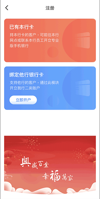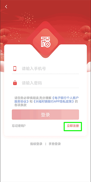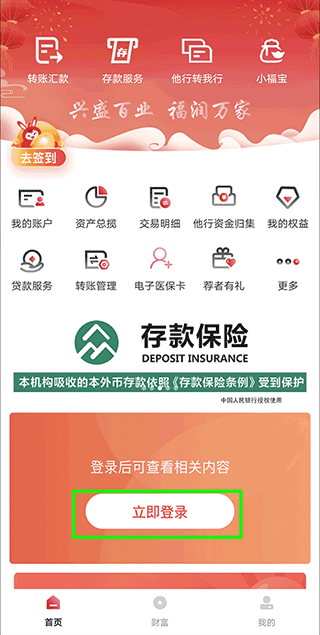 一、注册登录 1、打开兴福村镇银行APP官方版,在首页或者我的页面中,点击“立即登录”;