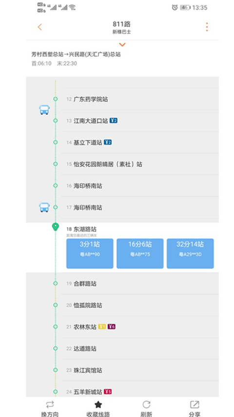4、如25路,它会就为用户提供首、末班乘车时间、路线途经站点、时刻表以及反向等交通信息;