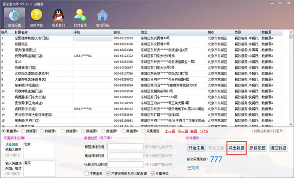 1、爱采集大师绿色版采用先进的大数据技术,极速体验,超强稳定 2、采集到的客户资料准确率98%,绝对真实有保障 3、智能去重技术,数据关键词过滤,关键词优化等功能,让你采集到更多的数据 4、方便的导出功能,可以导出到CSV、EXCEL、VCF 等文本文件,省去您自己加工的烦恼 5、服务期内免费升级、安装调试、数据分析、维护 6、付费授权可导出三种数据格式,号码不打星号 7、可提取数万数据,一键群发数万短信 8、可将号码批量导入电脑,可将号码批量导入手机 ,可将号码批量导入微信,为你的微信添加精准人脉群体爱采集大师官方版使用方法