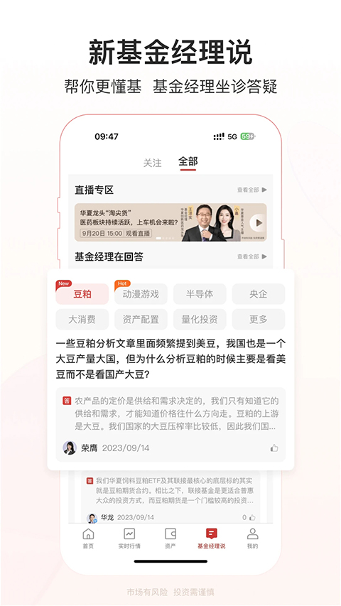 1、多: 基金经理交流多,产品报告多。 2、快:活期通(货币基金)实时快取,7X24 无休。 3、好:积分天天领,红包快乐兑。 4、省:积分购基 0 折起,超省钱。 5、全:可查询所有渠道买入的华夏基金公募产品。华夏基金app怎么添加自选基金