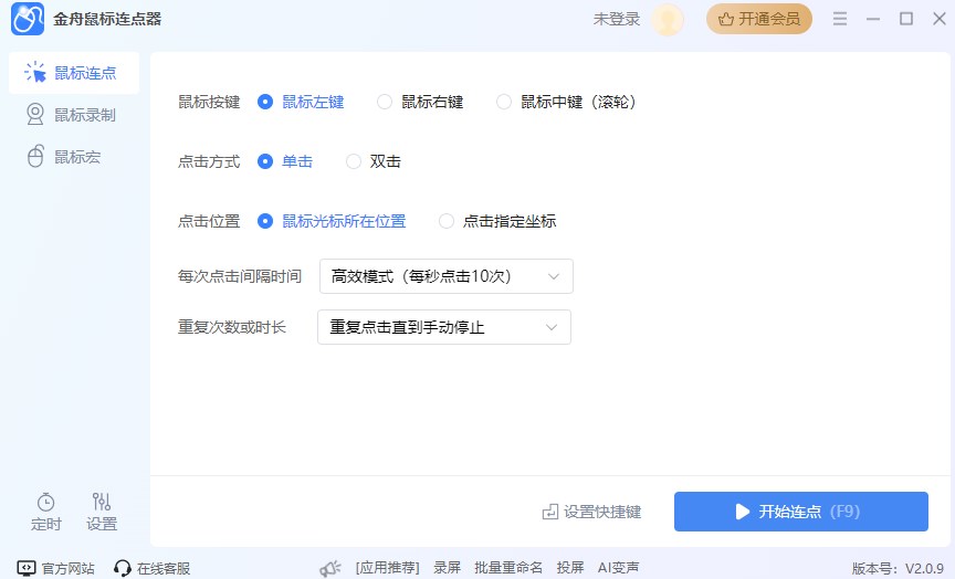 金舟鼠标连点器官方版是一款简单好用的鼠标连点器软件,它主要通过用户设定的位置、频率和次数去自动执行点击动作,从而模拟出鼠标点击来实现鼠标高速点击的操作,让重复操作轻松省事,效率倍增。