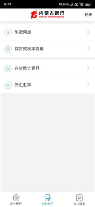 2、而且除了常用的企业银行服务之外,这里还可以直接查询到附近的营业网点和实用工具;