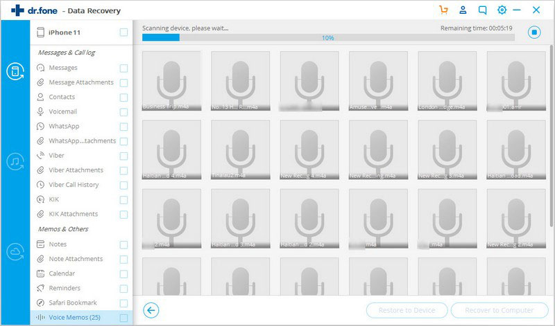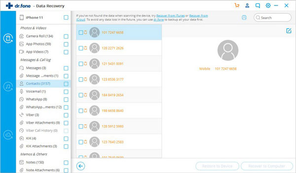 当您找到所需的数据时,只需在复选框前面打勾以选中它们。然后,单击窗口右下方的“恢复”按钮。默认情况下,恢复的数据将保存到您的计算机。至于文本消息,iMessage,联系人或便笺,当您单击“恢复”时,将弹出一个窗口,要求您“恢复到计算机”或“恢复到设备”。如果要将这些消息放回iOS设备,请单击“恢复到设备”。