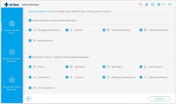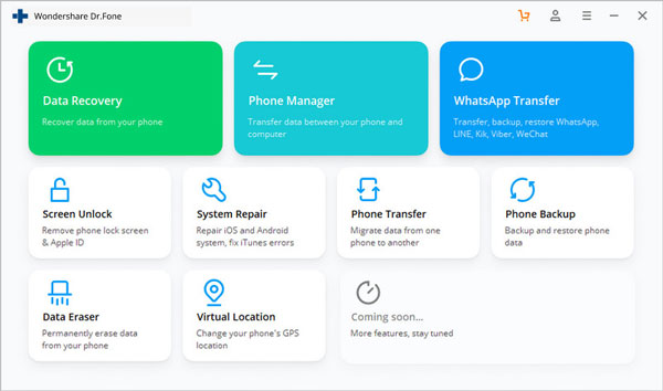 使用iOS设备随附的USB电缆将iPhone,iPad或iPod touch连接到计算机。然后在您的计算机上启动Dr.Fone并选择“数据恢复”。
