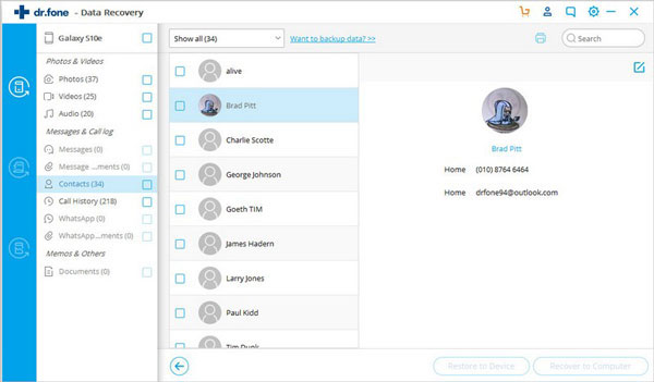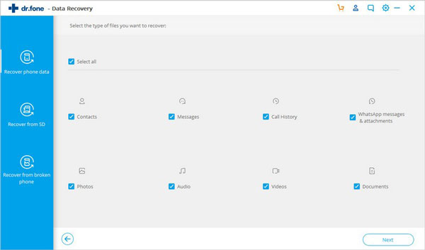 手机连接成功后,Android的dr.fone将显示其支持的所有数据类型以进行恢复。默认情况下,它已检查所有文件类型。您只需选择要恢复的数据类型即可。