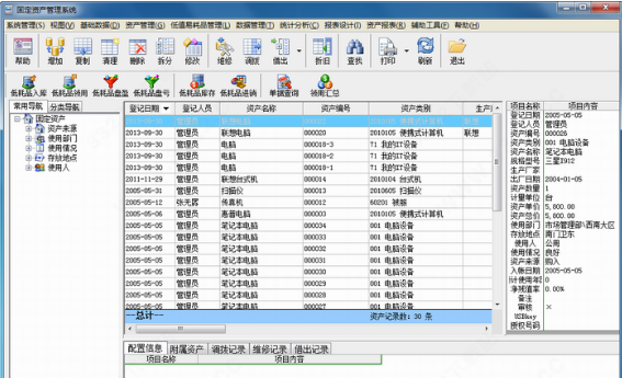 左侧是软件快捷导航树,双周导航树中的项目,可以按指定项目在右侧列表中列示符合条件的资产档案。