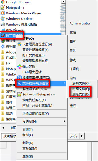 1、在开始菜单栏找到寰宇浏览器(参考第一种方式的步骤一),然后根据图中提示右键选择【文件粉碎】打开选择粉【碎文件】或是【删除文件】,这两种方式都可以进行卸载删除。