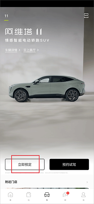 1、打开阿维塔汽车app,在车界面中点击立即预定。